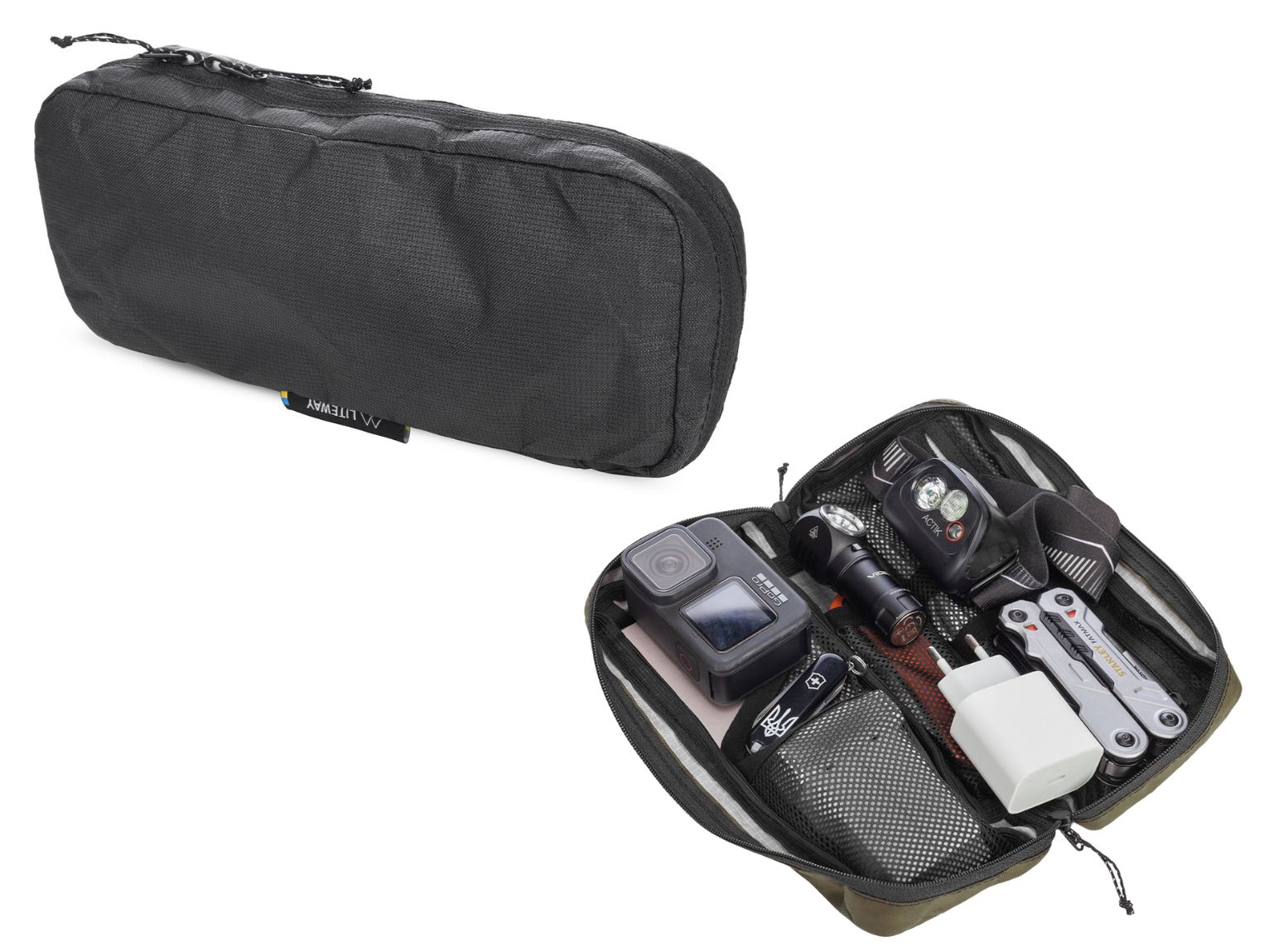 WASH BAGは、LITEWAYでは唯一の純粋なポーチです。内部にはメッシュの仕切りが多くあり、細かいものをわかりやすく収納する事ができるため、ガジェット入れとして使われている方が多い印象です。ジッパーが3辺に渡っているので、完全に開いて収納ができるのは収納が捗ります。あと、マチの幅が4㎝あるため、厚めのギアも簡単に収納できます。山行での使用に限らず、細かいガジェットから日用品を入れるポーチとしても便利に使用できると思います。