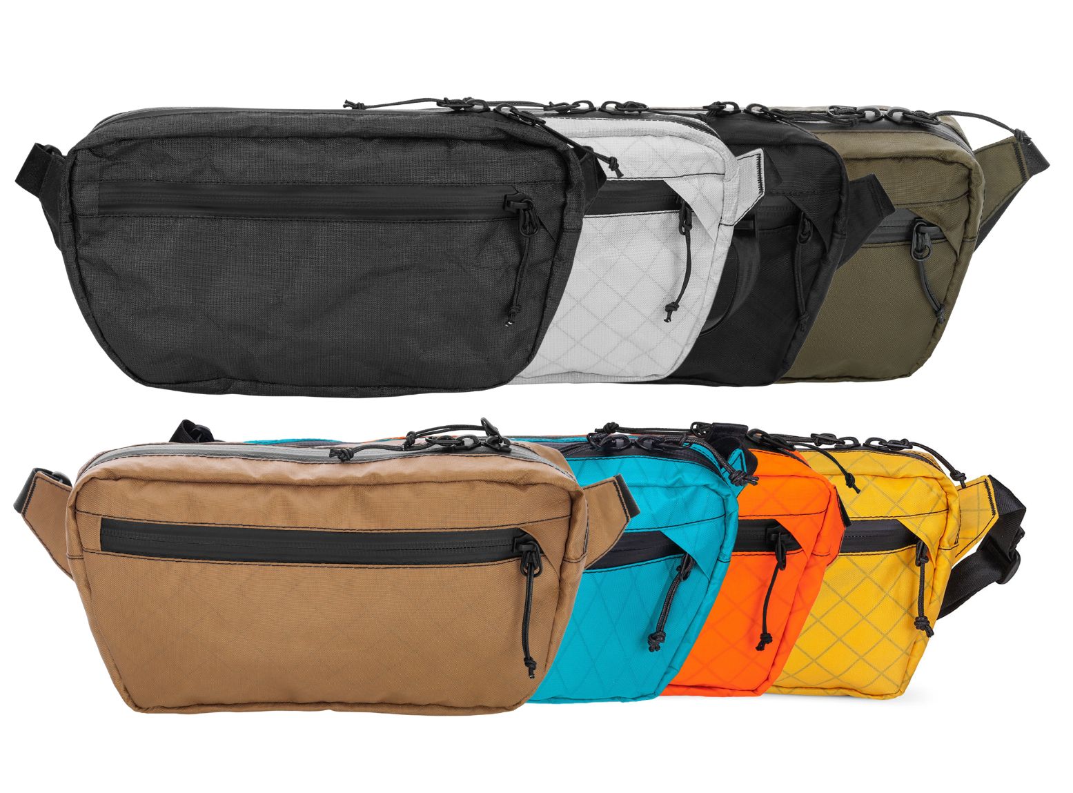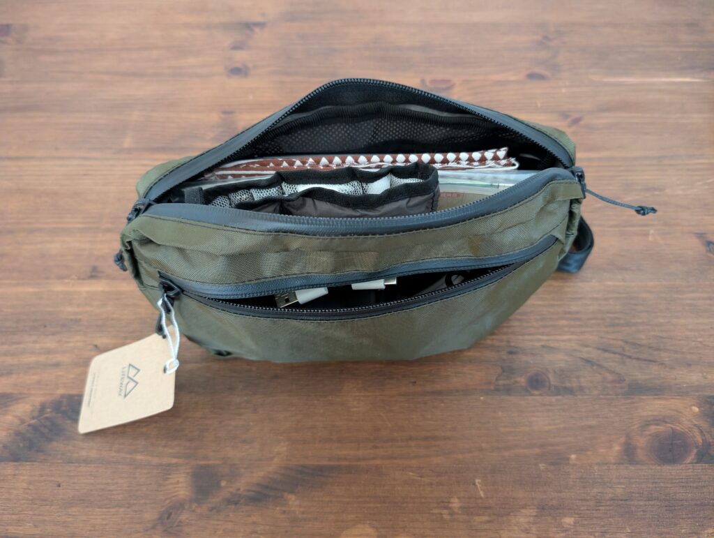ポーチ(ではないですがあくまで今回の分類として、、)の最後は、どちらもLITEWAYのウエストバッグです。POKKIE PACKは、1つのジッパー付きポケットのみで構成されていますが、内部はメッシュの仕切りが1つあり、キーリングも備えています。収納力としては後述のFANNY PACKに劣りますが、シンプルな作りなので見た目以上に収納できると感じました。POKKIE PACKはULハイカーのウエストバッグとして最も最適だと思います。