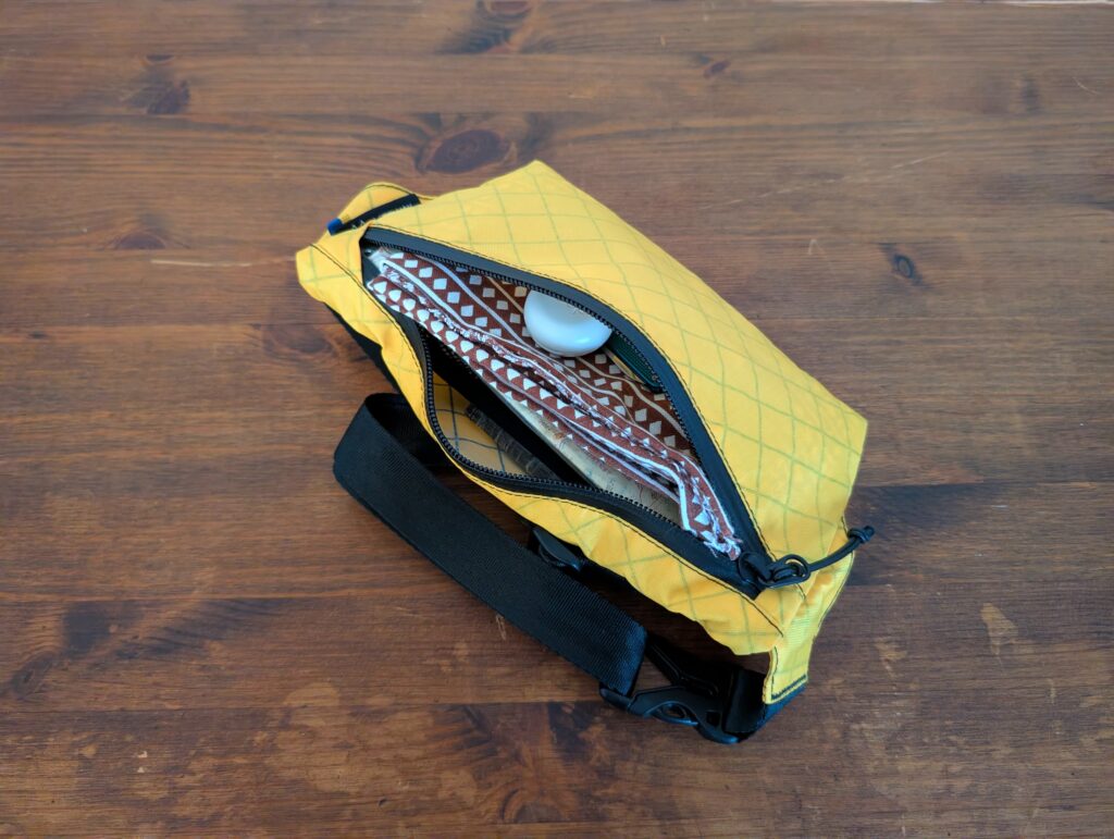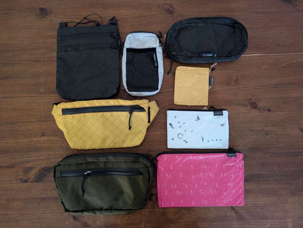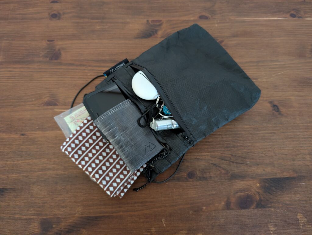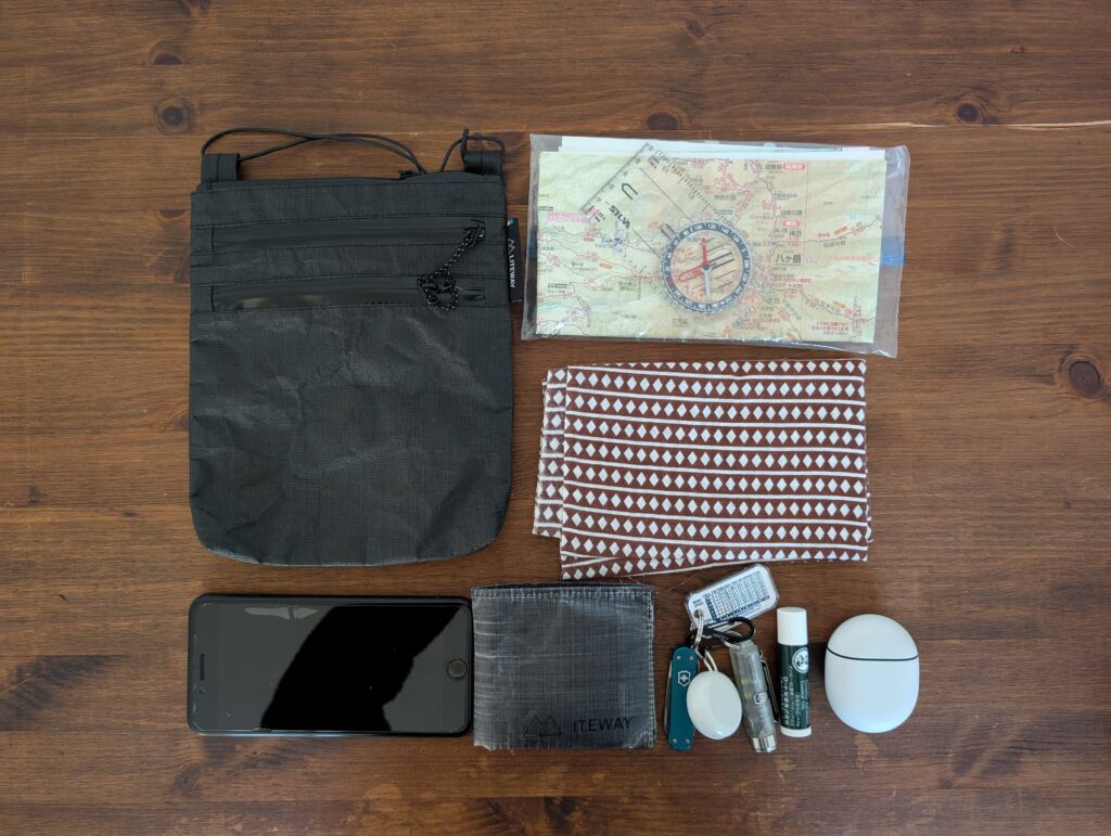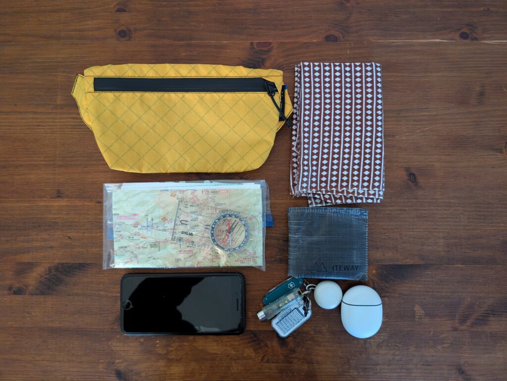 TRAVEL WALLETは小さめのサコッシュで、後述するPOKKIE PACKとスペックとしては同じ収納力ですが、3つのジッパー付きポケット+キーリングで構成されているため、TRAVEL WALLETの方が使い勝手は良いと思います。欠点としてサコッシュは身体との一体感が弱く、身体を動かす山行中はバタバタと動くのが気になる方も多いいため、山行より街中の方が活躍できると思います。なお、私はデザインや機能性に惚れ、普段使いで愛用しています!