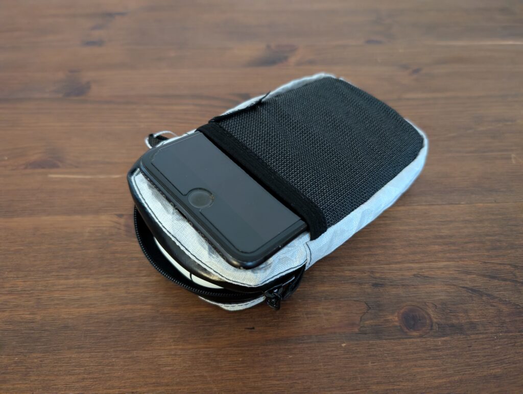 LITE POCKETは、バックパックのショルダーハーネスに取り付けて使用します。デイジーチェーン(ショルダーの輪っか)が着いているバックパックならばメーカーを問わず取り付け可能です。山行時にスマホや行動食、財布など素早く取り出したいものを収納すると非常に便利です。今回使用したスマホは8×16㎝ですが、フロント部分の黒いメッシュに丁度収まるサイズ感でした。ジッパー付きのメインポケットには、もうワンサイズ大きいスマホも収納できますね。