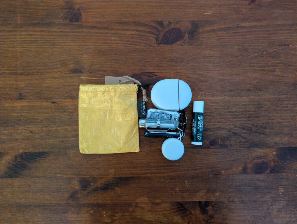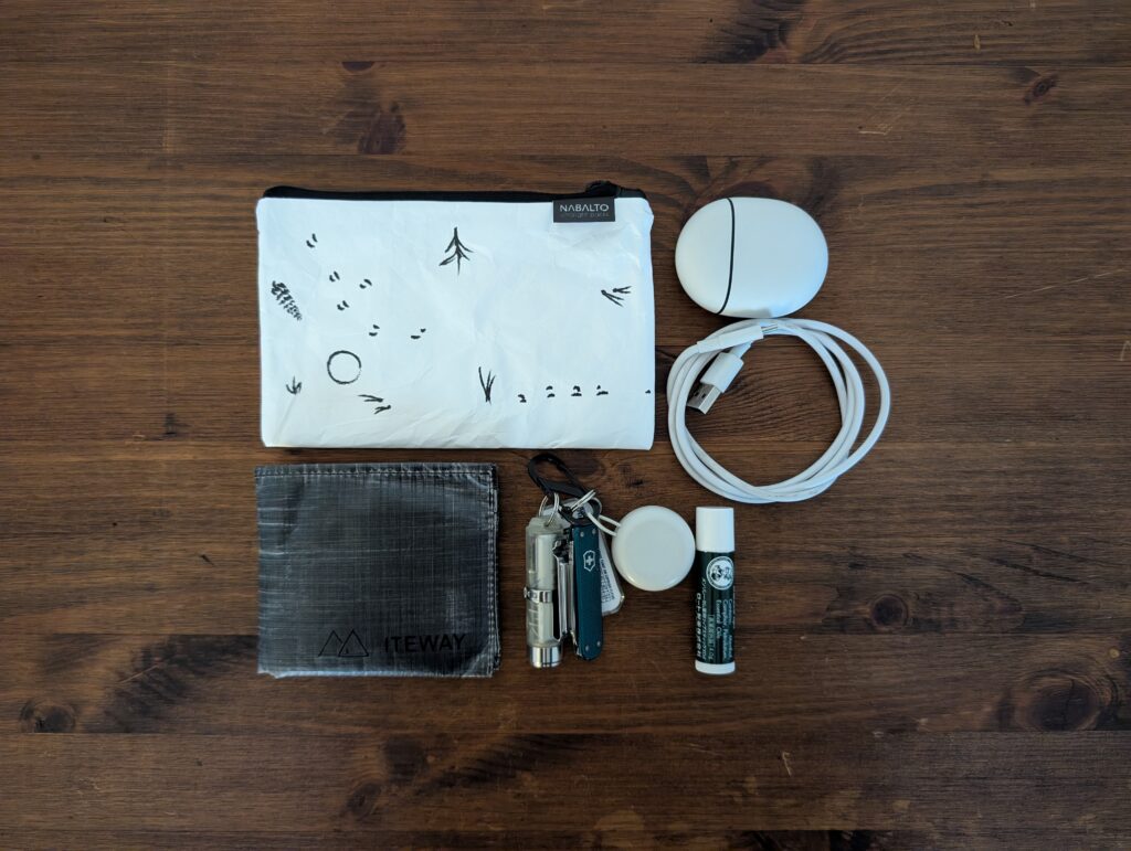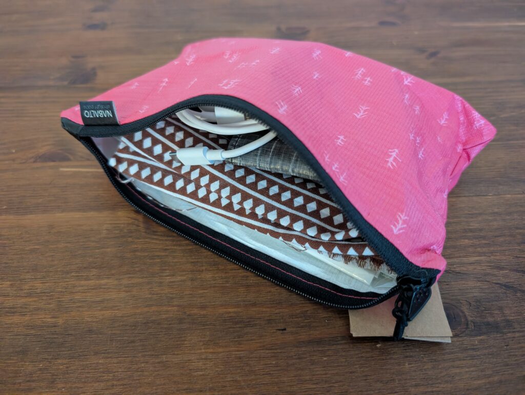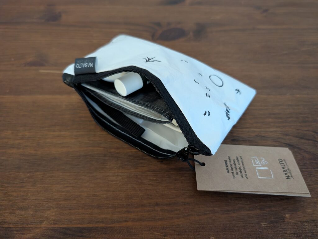 NAMYDLOは、サイズ感が丁度いいシンプルなポーチに仕上がっていて、収納量と携行のバランスがとても良い印象です。シンプルな作りなので思った以上に何でも収納できてしまう頼もしい印象を受けました。また、生地が触り心地の良いソフトタイベック(前述のNAKARTUとNACENNEはハードタイベック)を使用しているので、持っているだけで気分が良くなってくるのも魅力ですね。