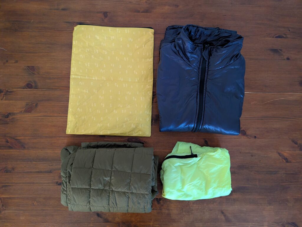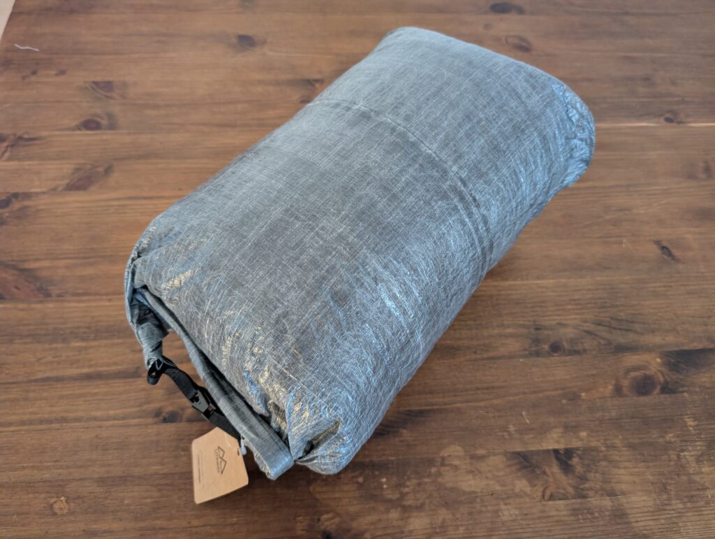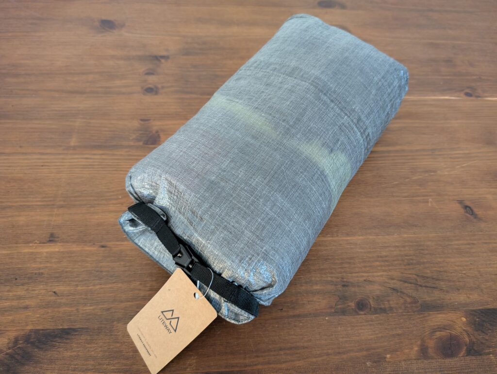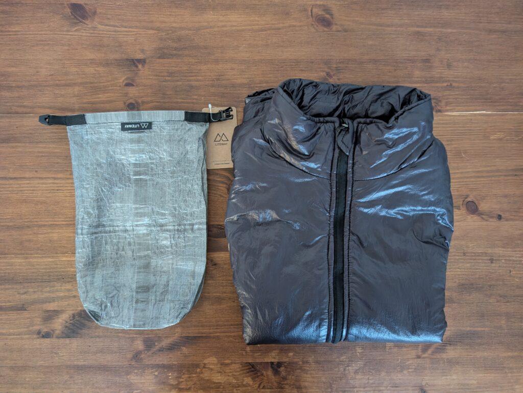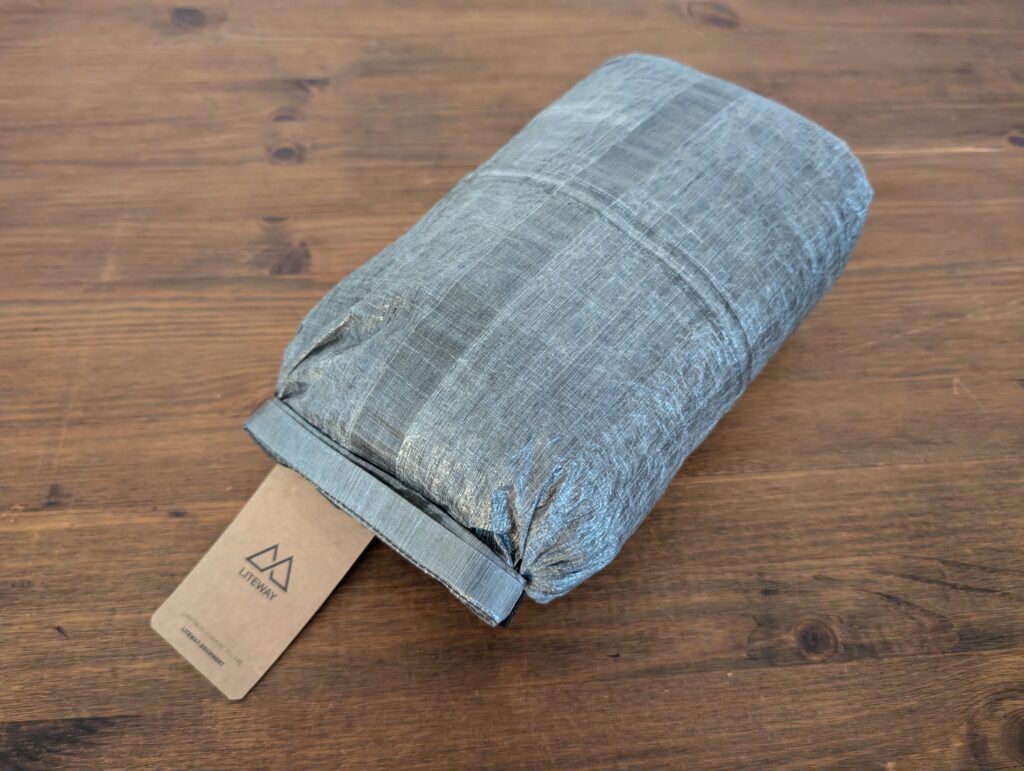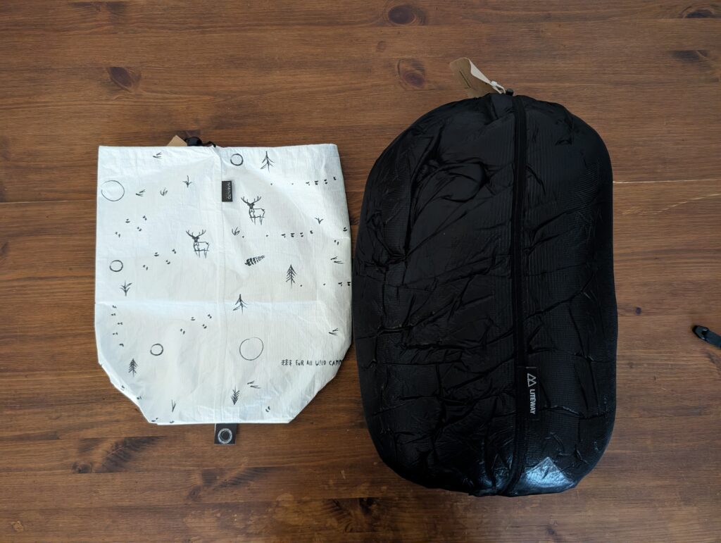 LITEBAG DCF 12Lは、LITEWAYの高機能化繊キルト(快適温度:+1℃)を丁度収納する事ができました。重量が635gで温度帯的にもそこそこ厚手のキルトなので、収納出来る化繊キルトや温度帯の高い化繊シュラフは多いと思います。ダウンモデルであれば、ほとんどのキルトを収める事が出来ると思います。ロールトップなので、収納してからの圧縮も容易な点も見逃せません。